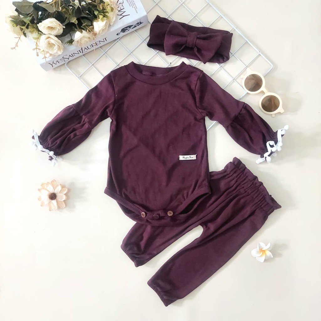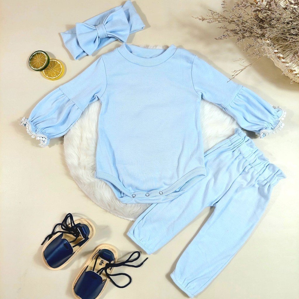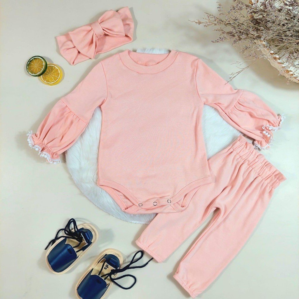 oneset ini cocok banget buat bayi yang aktif, terdapat renda bulat-bulat di bagian lengannya, tambahan bandana pita yang super cantik, oneset ini cantik buat jalan-jalan loh Bund✨